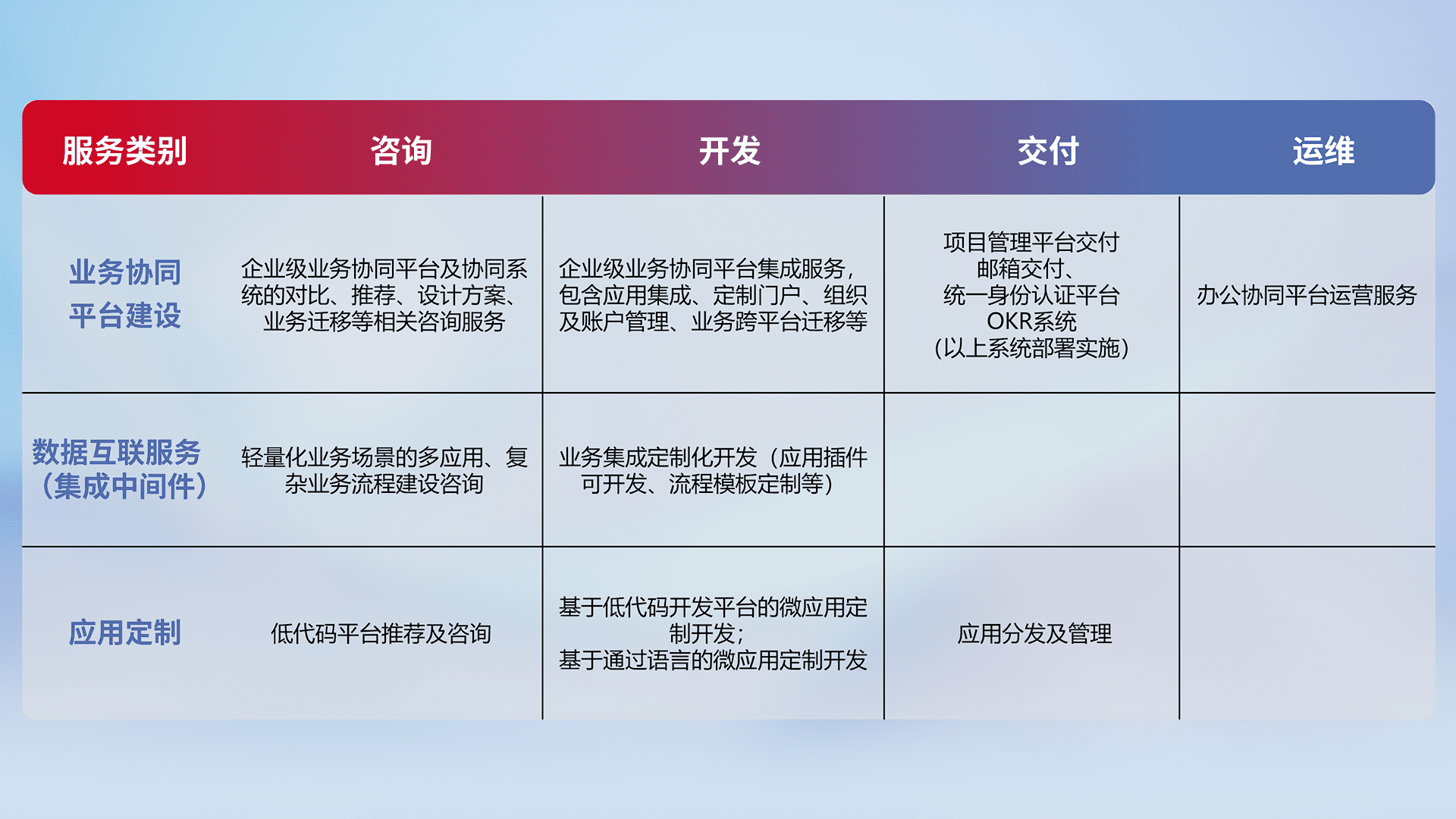 针对钉钉、、、企微、、、、IDaas等平台级产品提供产品的规划、、、、方案、、、、交付、、、、定制化开发等服务,,,,实现如统一协同办公、、、智能客户服务、、、混合会议管理、、、、智能数据查询、、等业务场景,,,,实现数字化转型。。